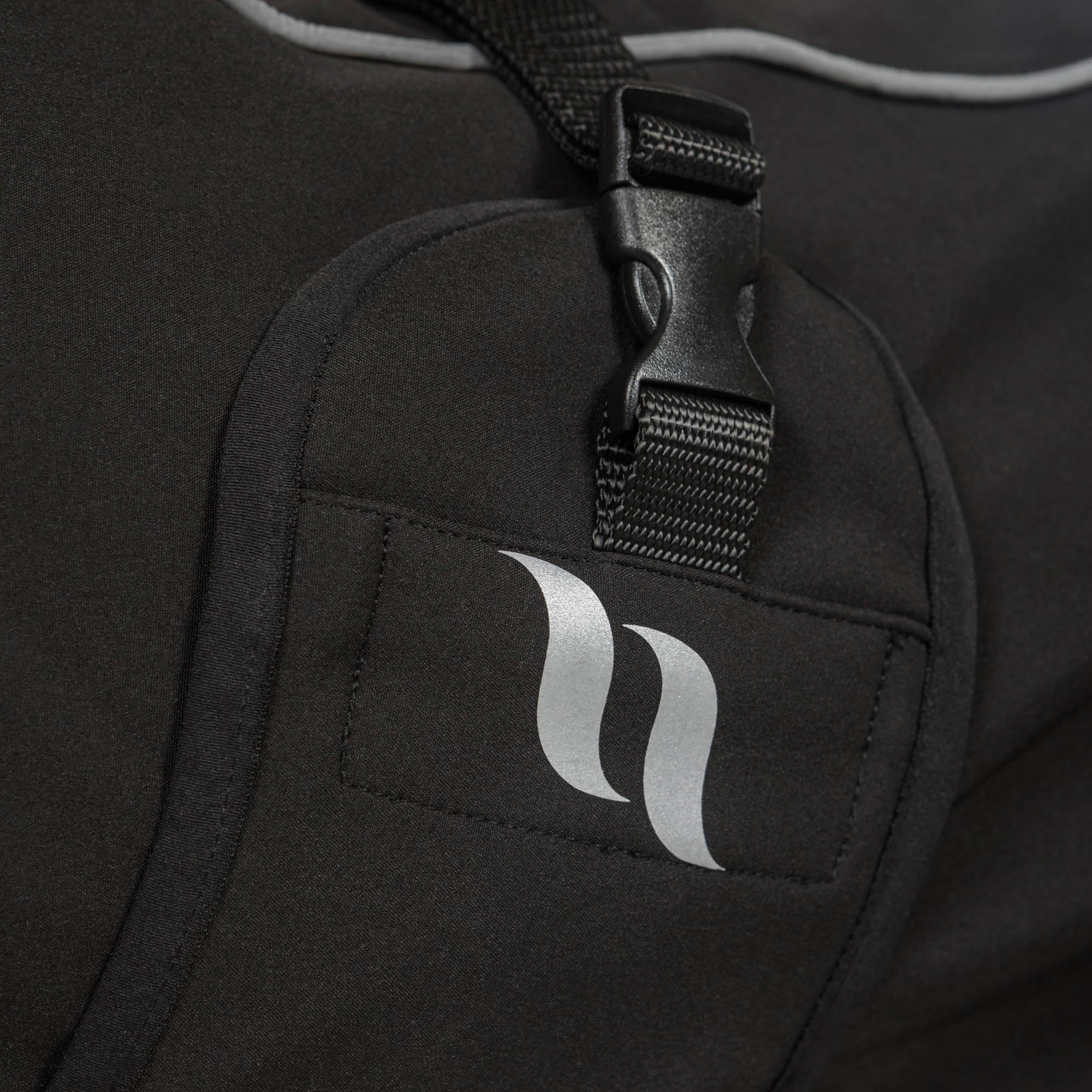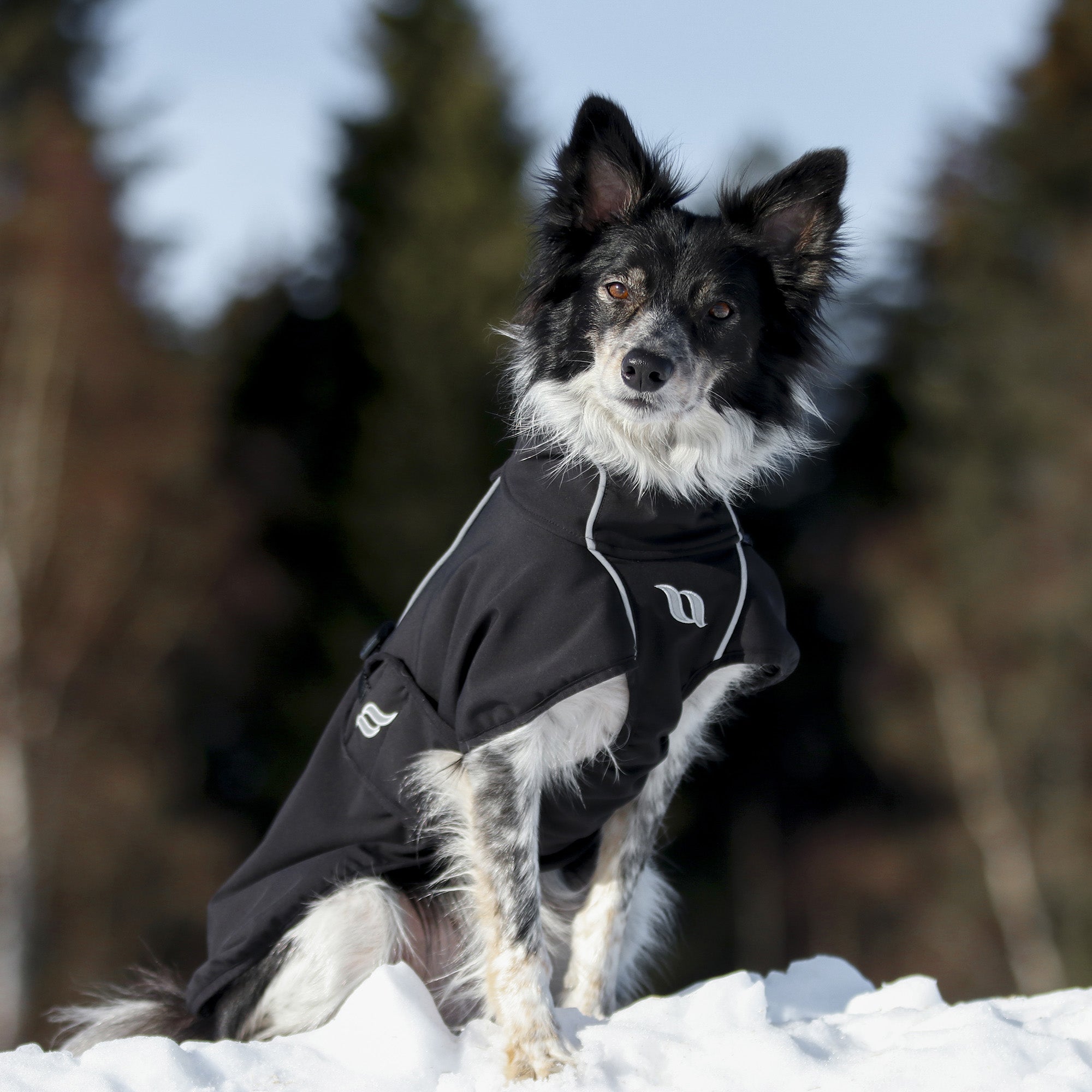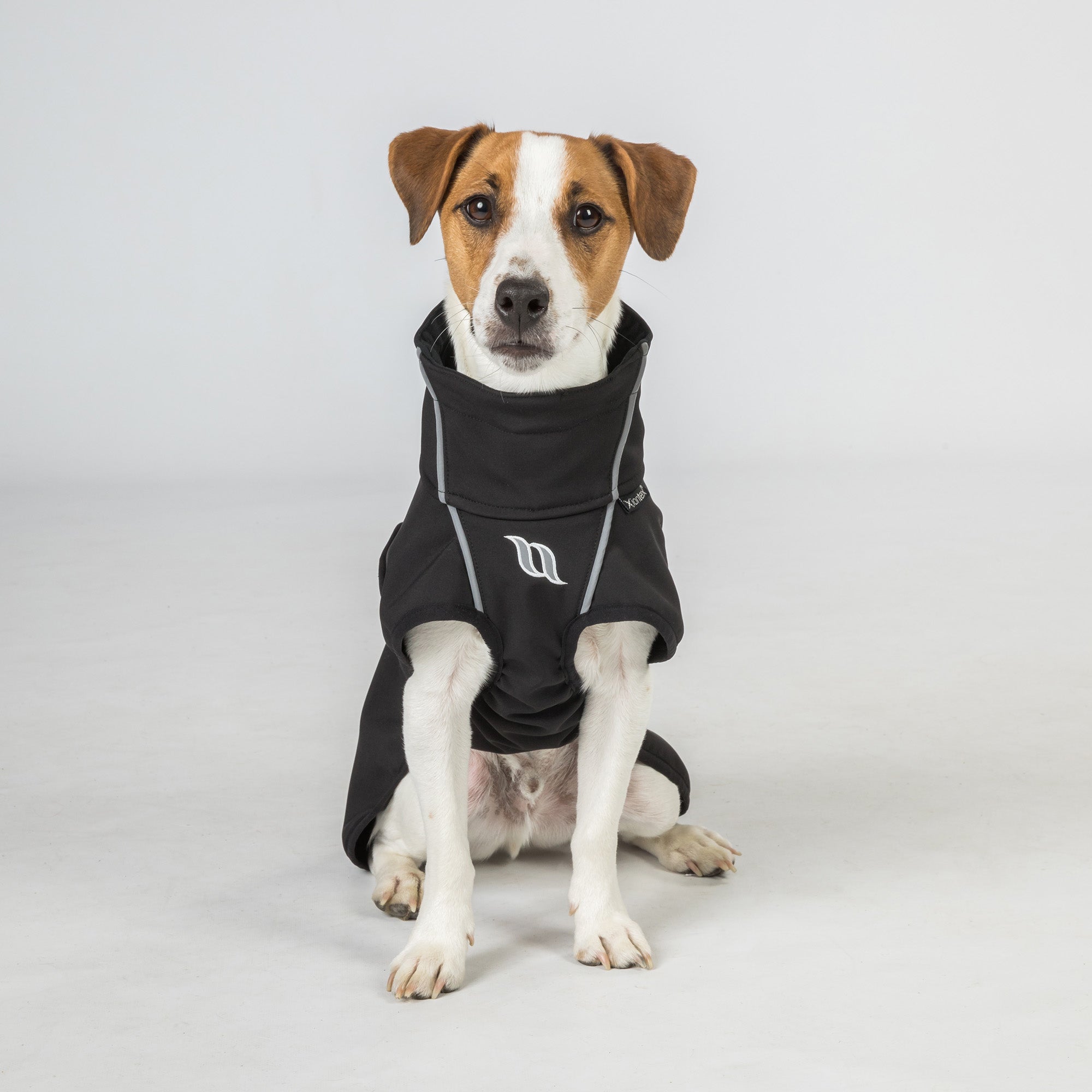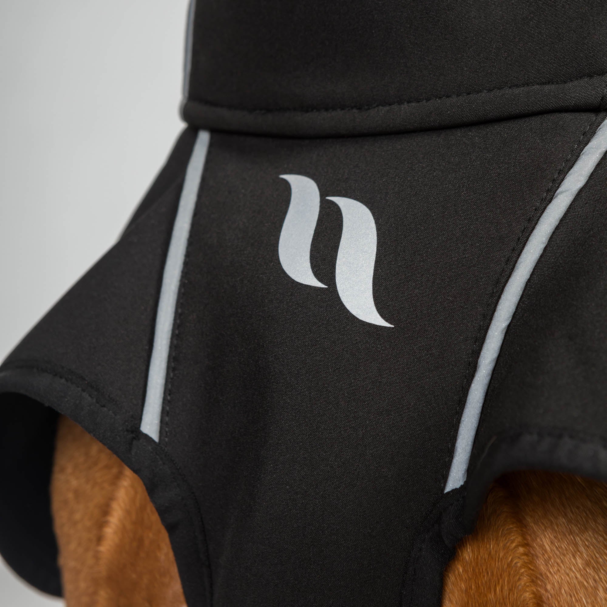 The Bark Soft-Shell Reflective Dog Coat is visible from all angles with reflective details and a hidden reflective pattern for extra safety in the dark.