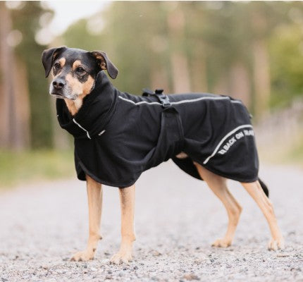 Designed for comfort and freedom of movement, the coat offers a snug fit around the chest and thighs with a wraparound front that leaves plenty of room for the legs. Tailored for dogs with both a high-tail set and low-tail set, the back and chest both include an adjustable drawstring for a customizable fit.
