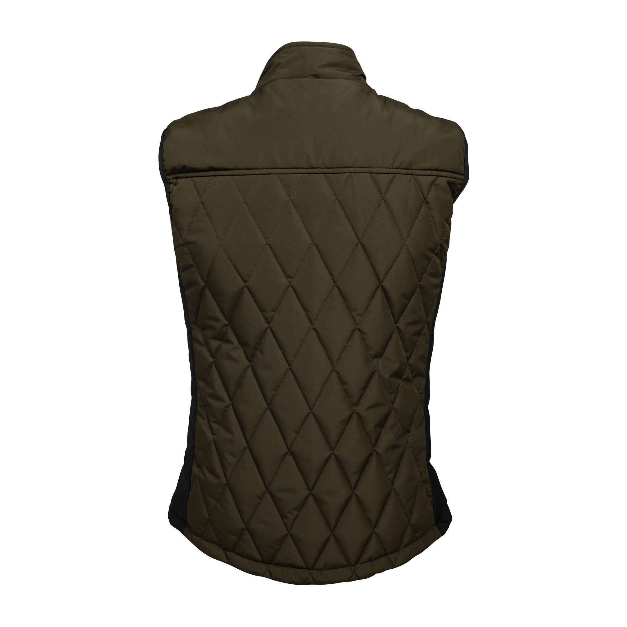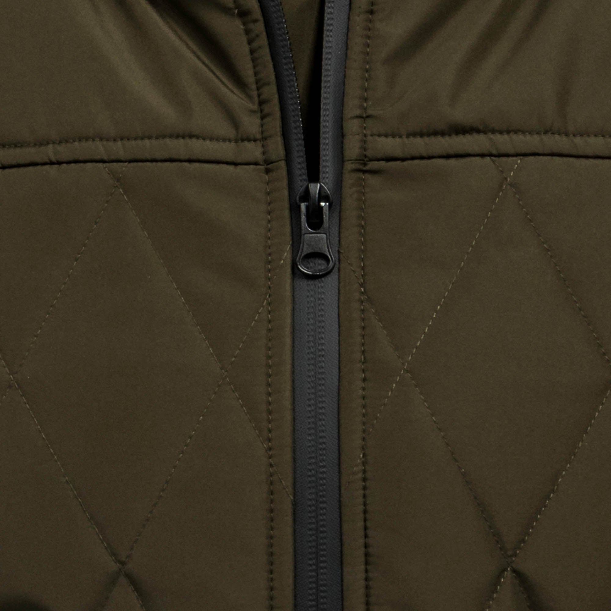 The vest is saturated olive green with black zippers.